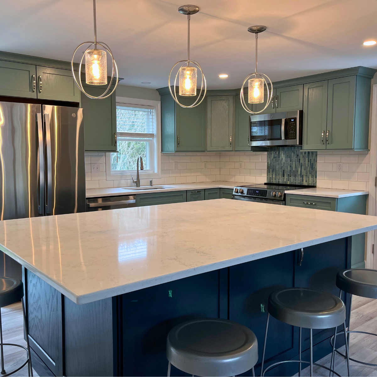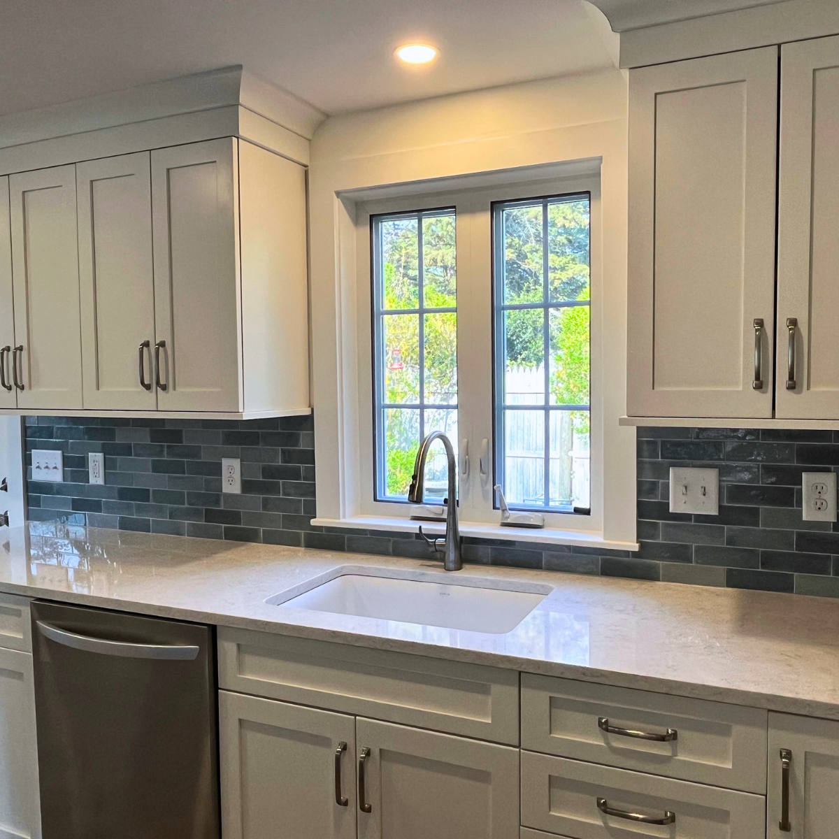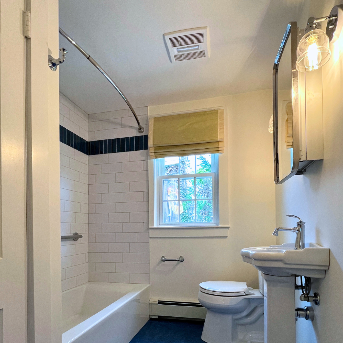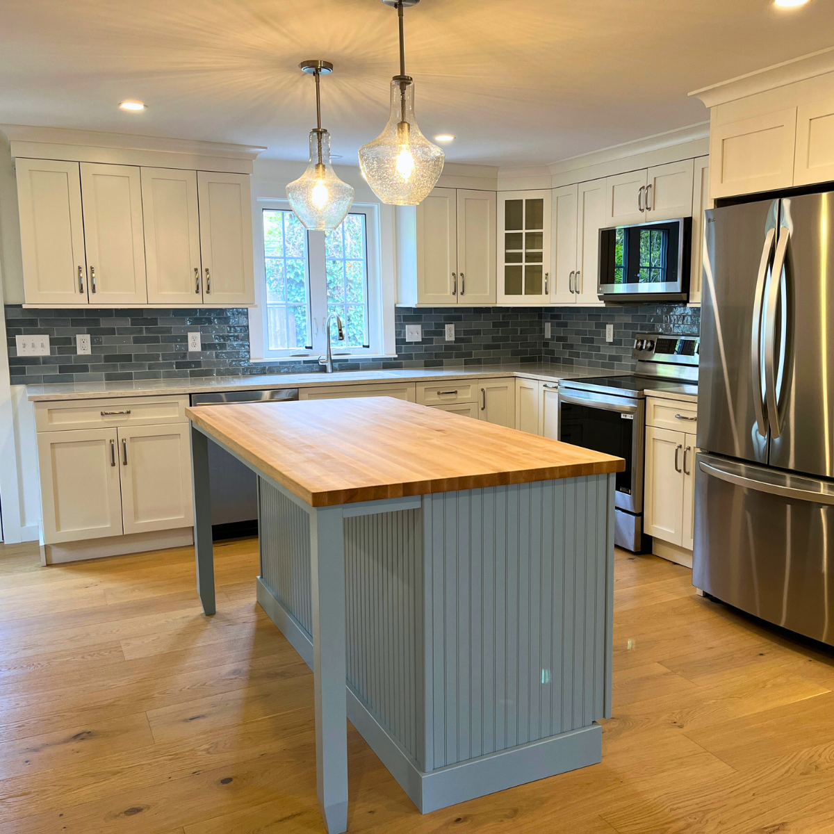 This 1920s Falmouth Heights cottage was short on space but had an abundance of charm. The homeowners wanted to completely update the home to maximize the available space while retaining the character of the original cottage. We removed walls to create an open concept living, dining and family room. We maintained original wood paneling and glass doorknobs while adding details like butcherblock countertops and a beadboard trimmed island for a perfect blend of modern meets cozy. Bright blue accents, including a custom wooden screen door, give the exterior a coastal cottage feel, while new windows add energy efficiency.