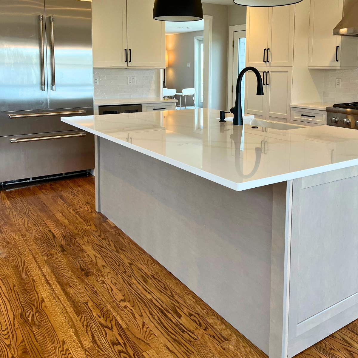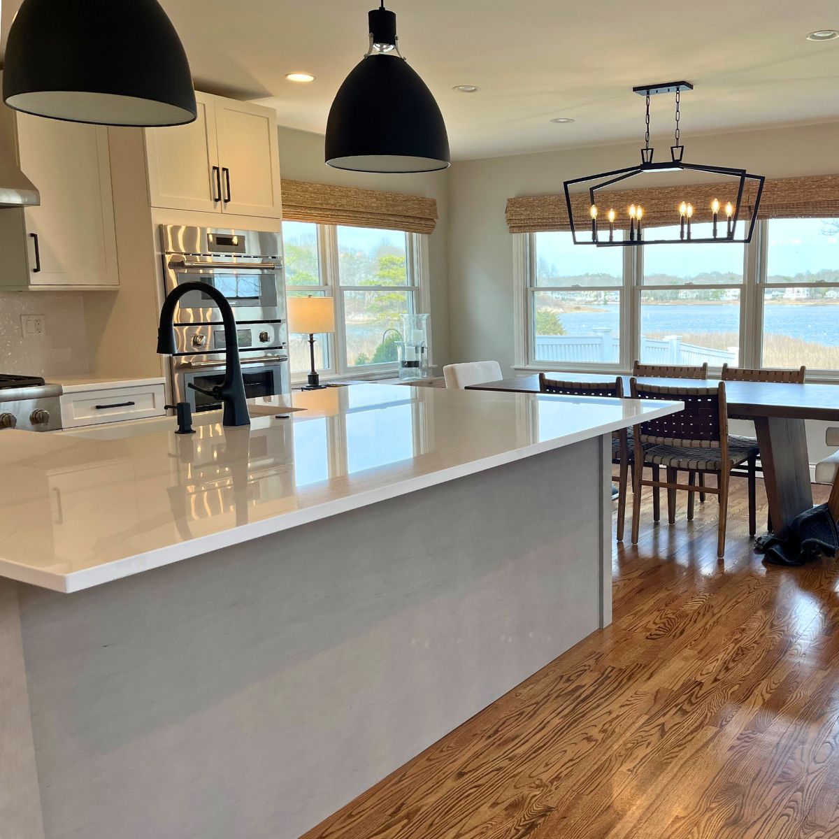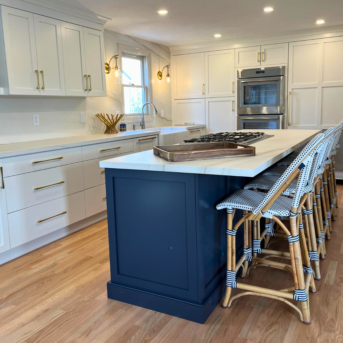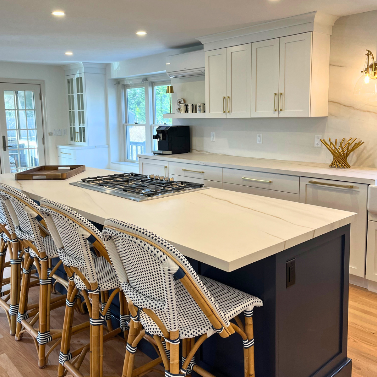 A water leak led to a complete kitchen makeover including custom cabinets and a huge island for seating. Our favorite feature is the backsplash behind the range made from quartz in the shape of Cape Cod. Cooking and entertaining are a dream in this kitchen!